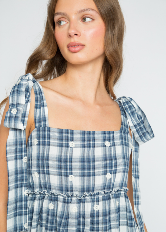 Daisy Street - Dolly Blue Check Mini Dress with White Flowers
