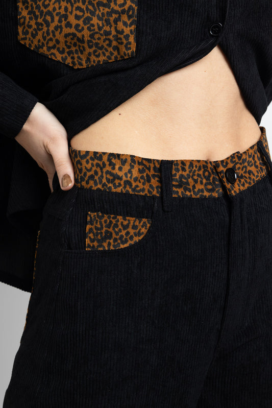Daisy Street - Black Cord Trousers with Leopard Print Contrast Details