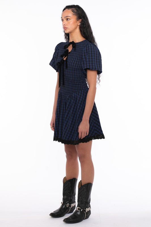 Daisy Street - Blue & Black Gingham Mini Dress with Bow Front