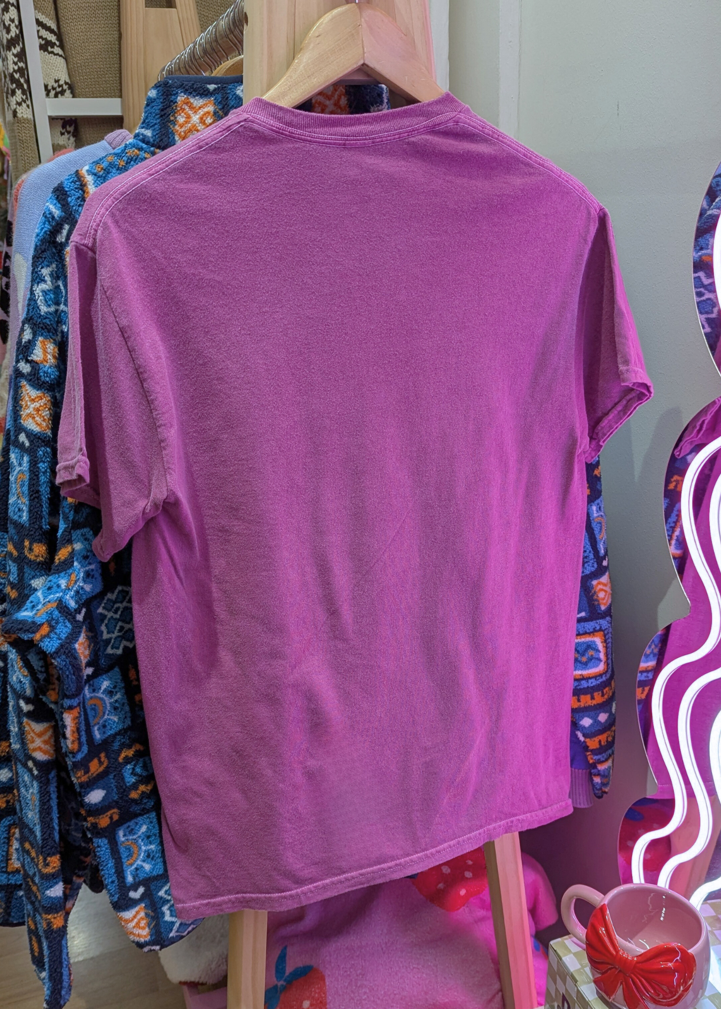 - Deep raspberry tee with the angriest little cat design!