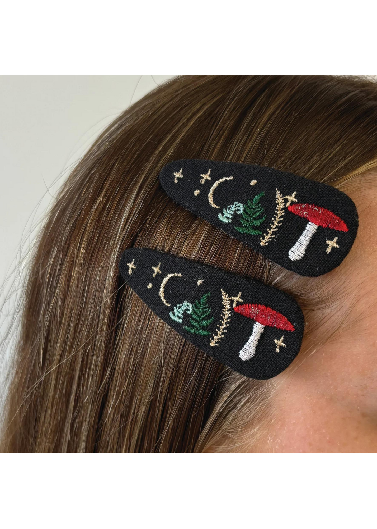 - Each hairclip features a beautiful embroidered forage scene with mushroom, ferns, moons and stars