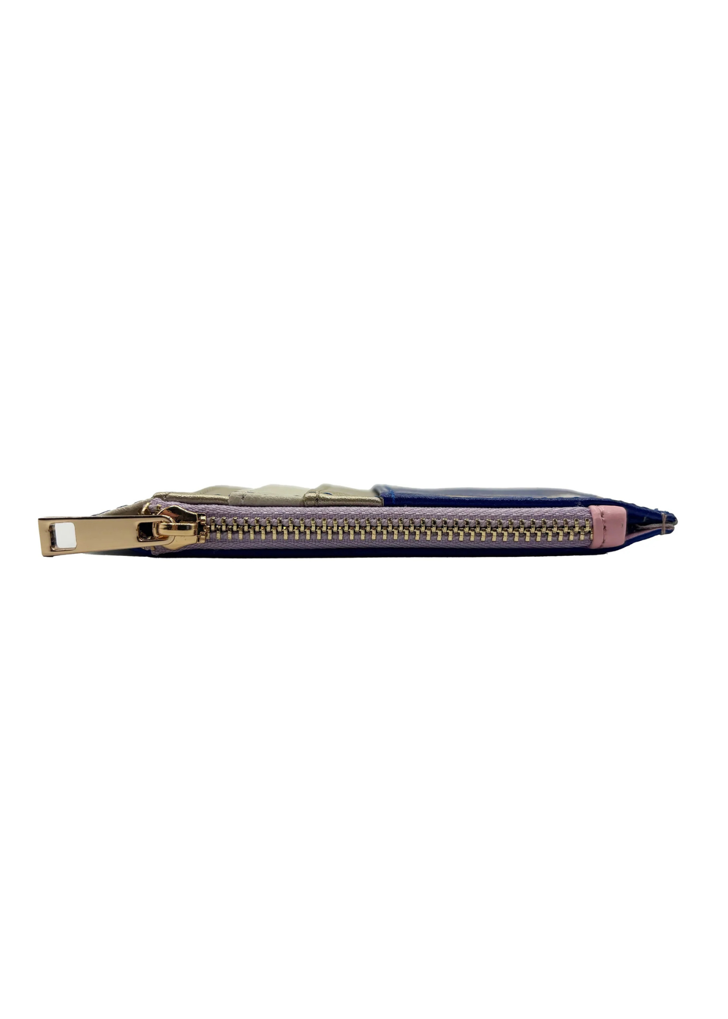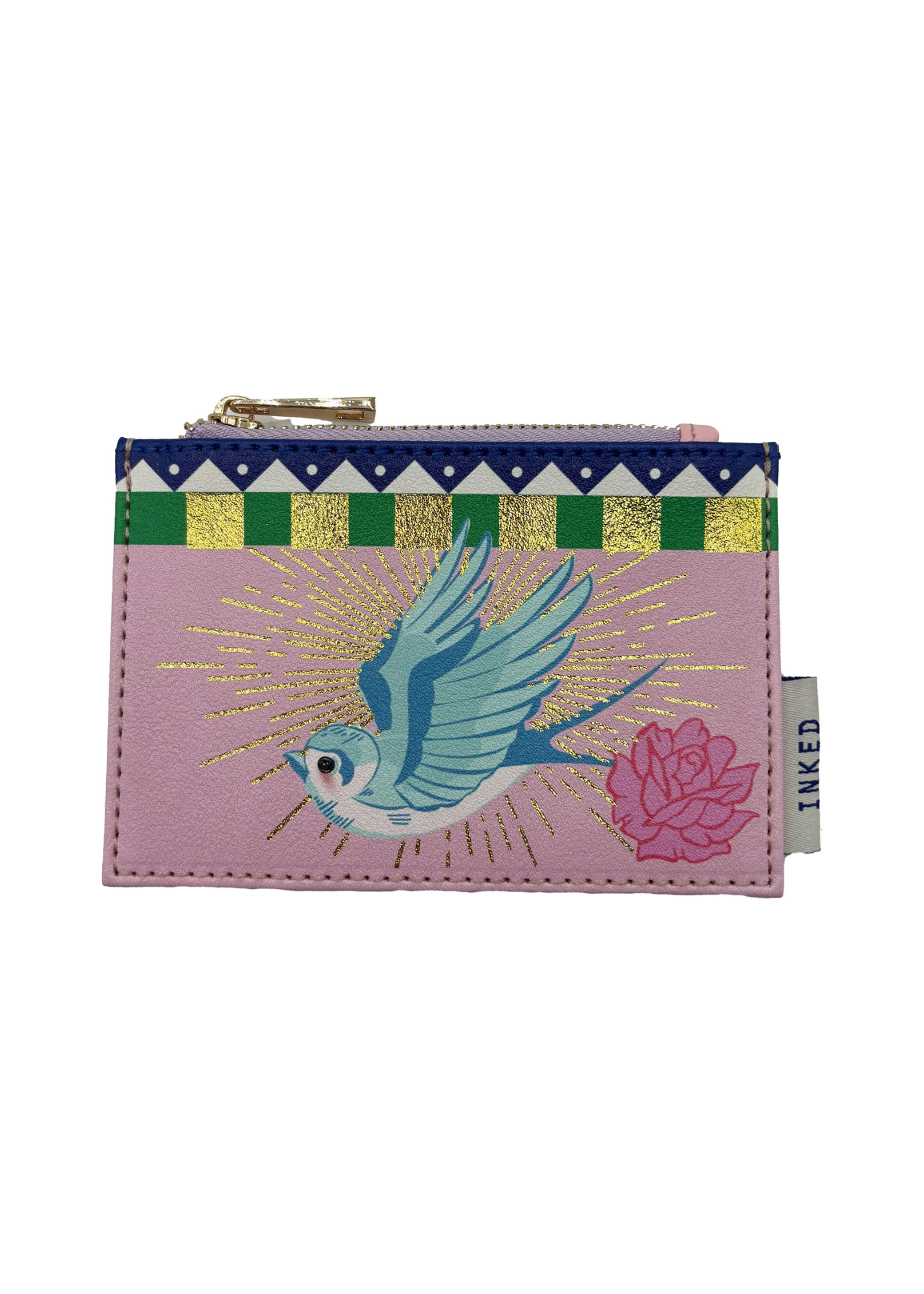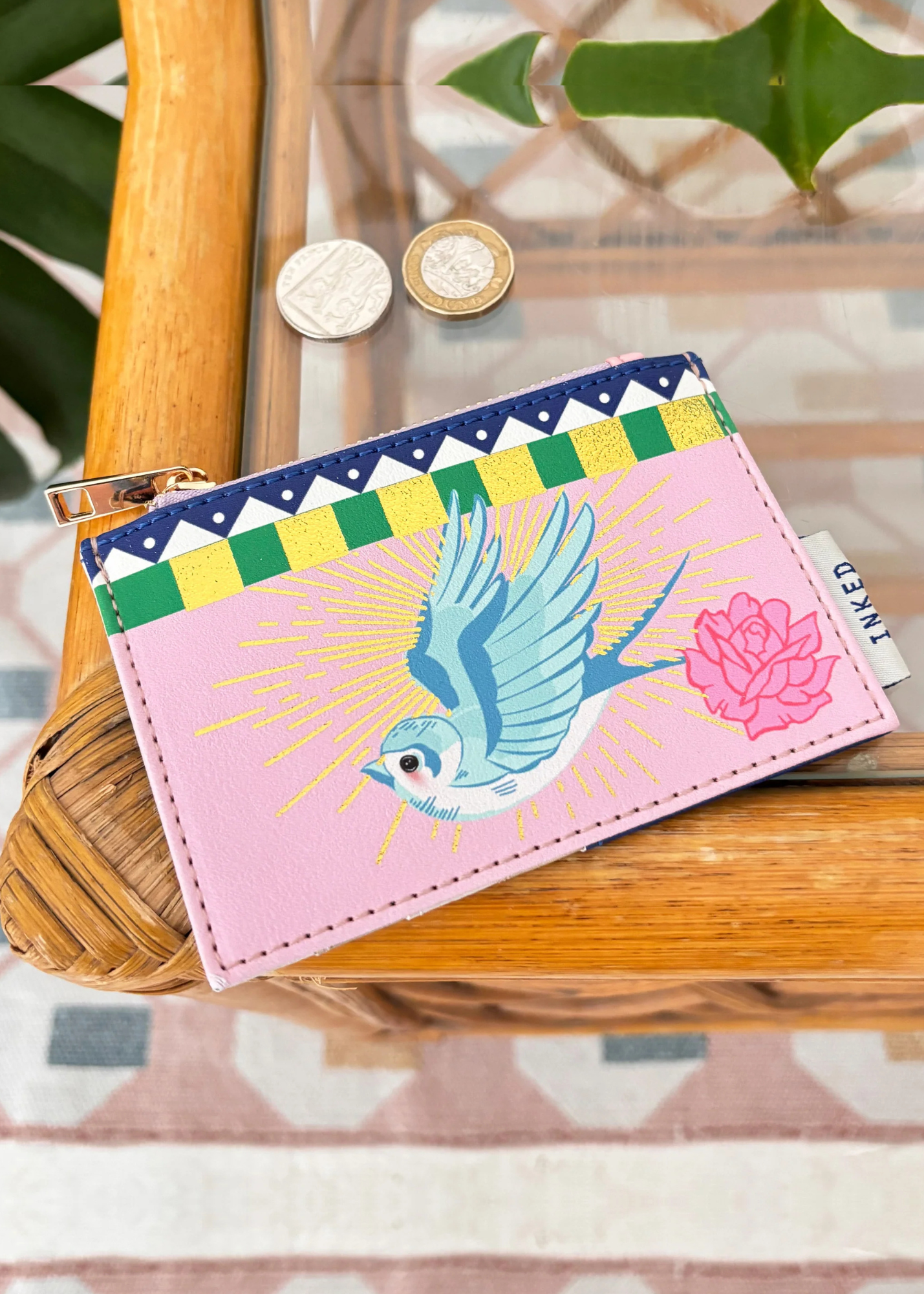 - Cool purse with a traditional tattoo swallow motif, pink flower gold foil sunburst