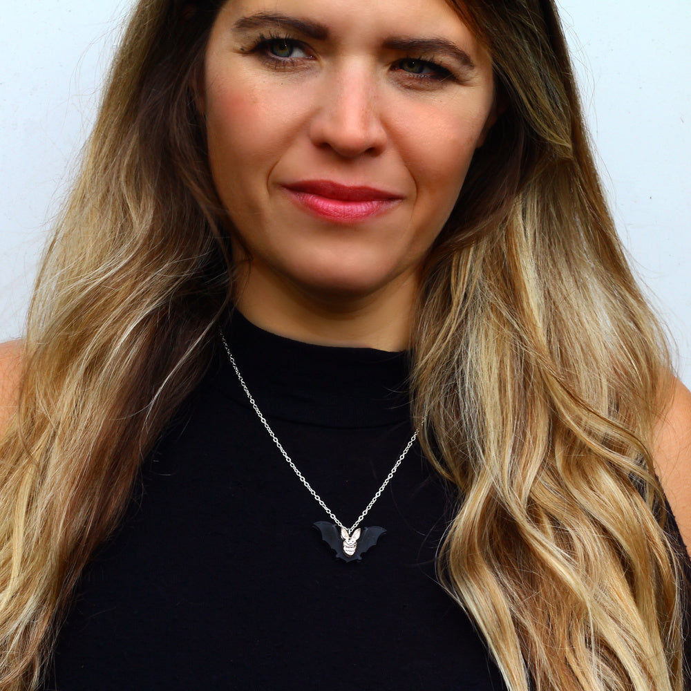 - Cute Long-Eared Bat with semi transparent wings, cute etched face on a mirrored bronze body