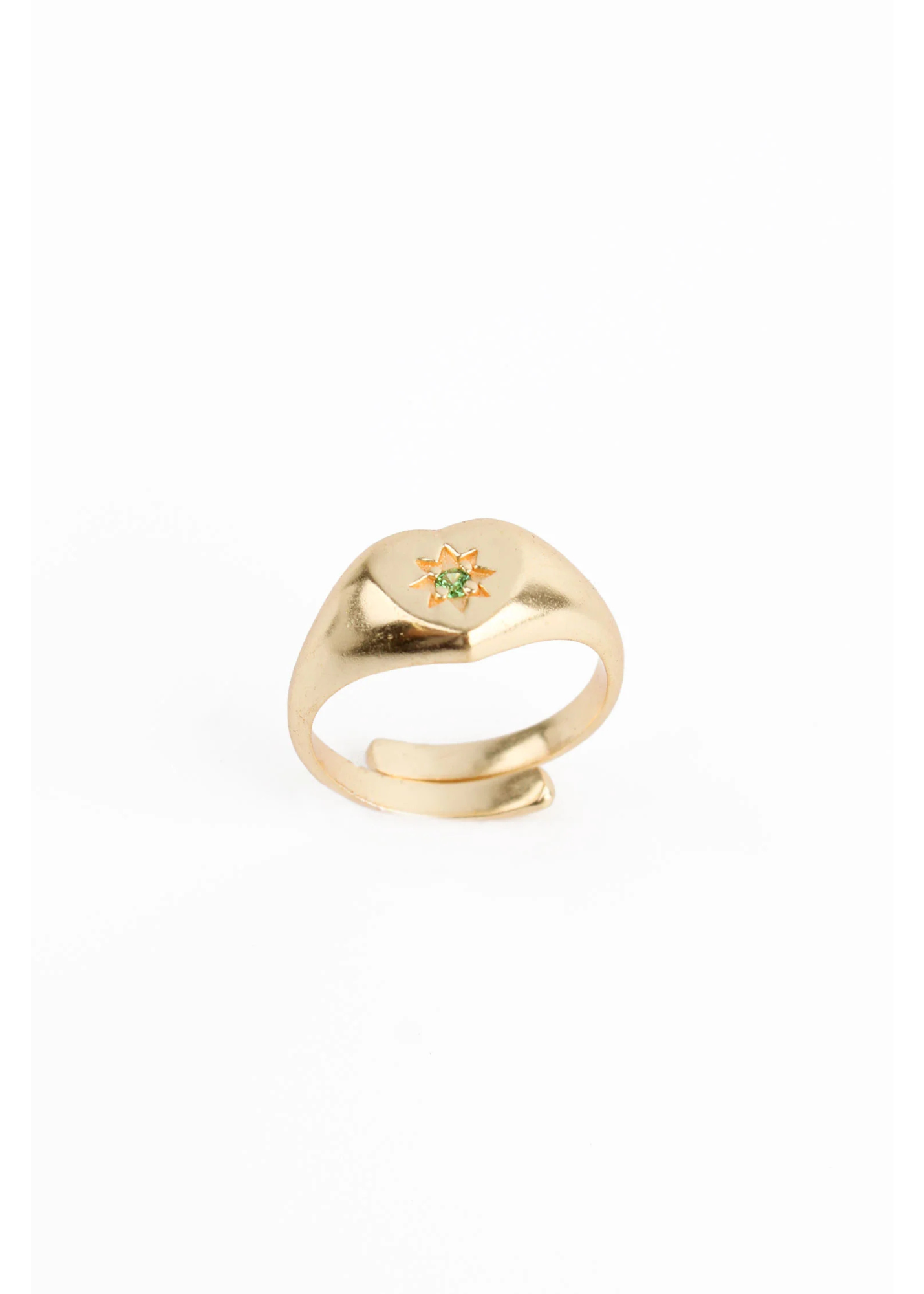 - Features a starburst bevel that sits a light green cubic zirconia crystal