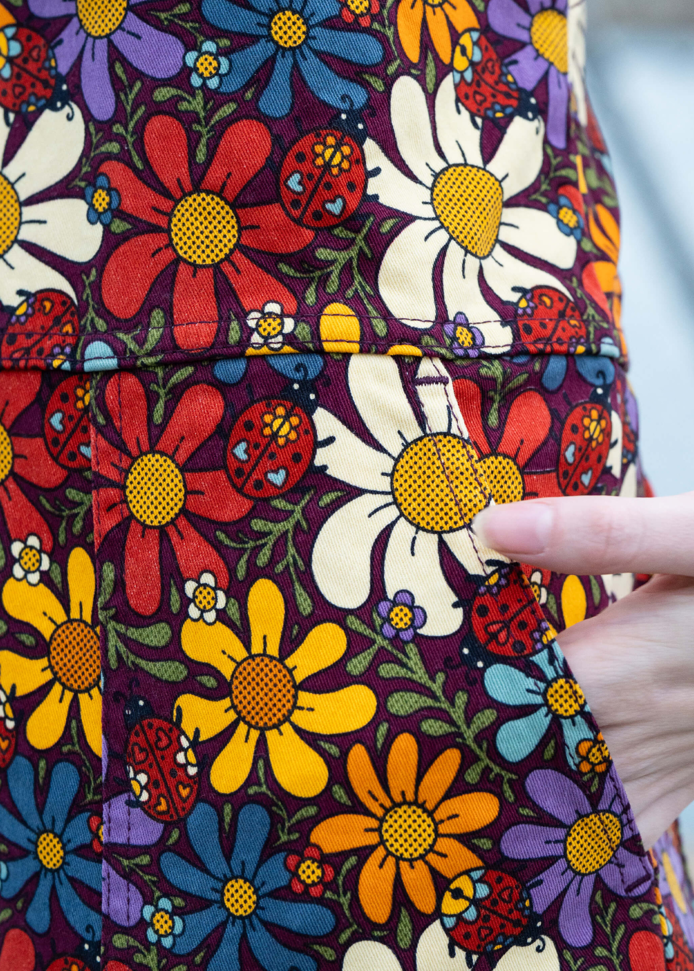 - The design features sweet lady birds with small hearts and flowers on their body and bright colourful flowers on a burgundy background