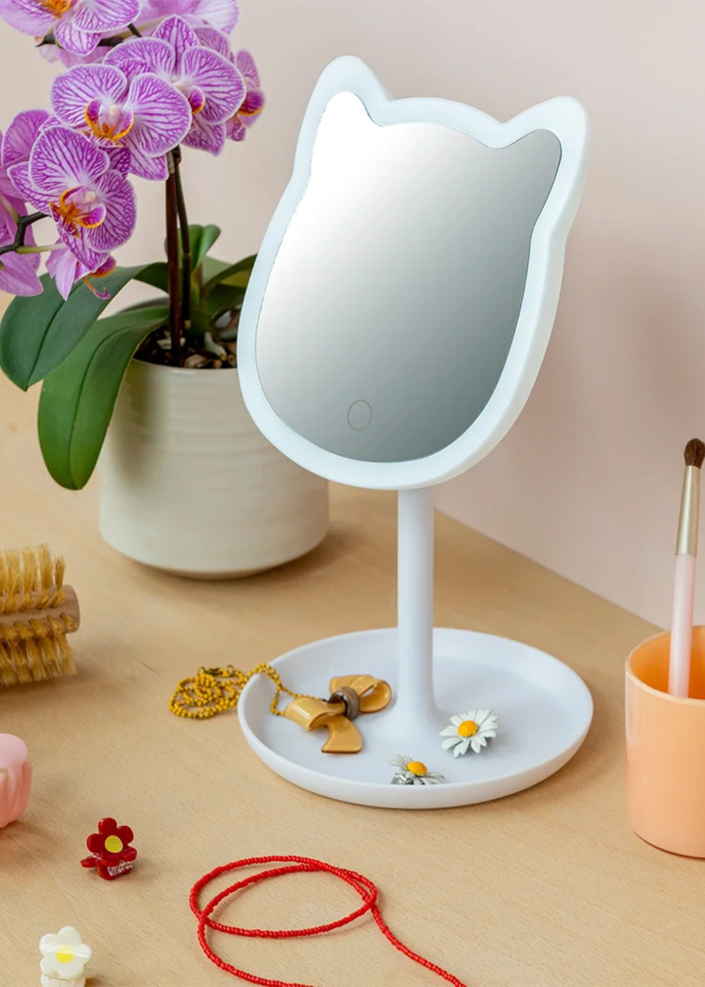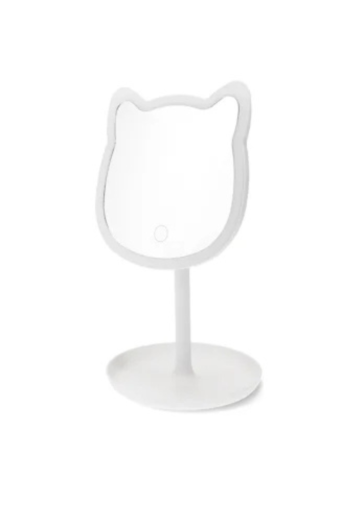 - LED light framing the cat face, with an on/off button at the bottom of the mirror