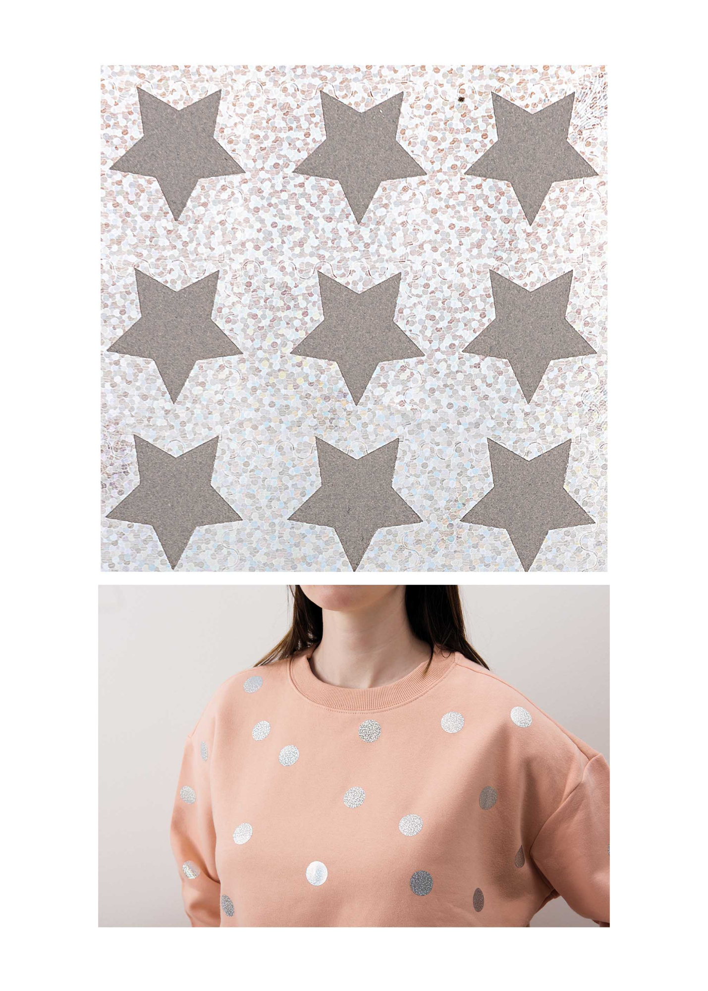 - Features a set of 9 iridescent stars to iron on to fabric.