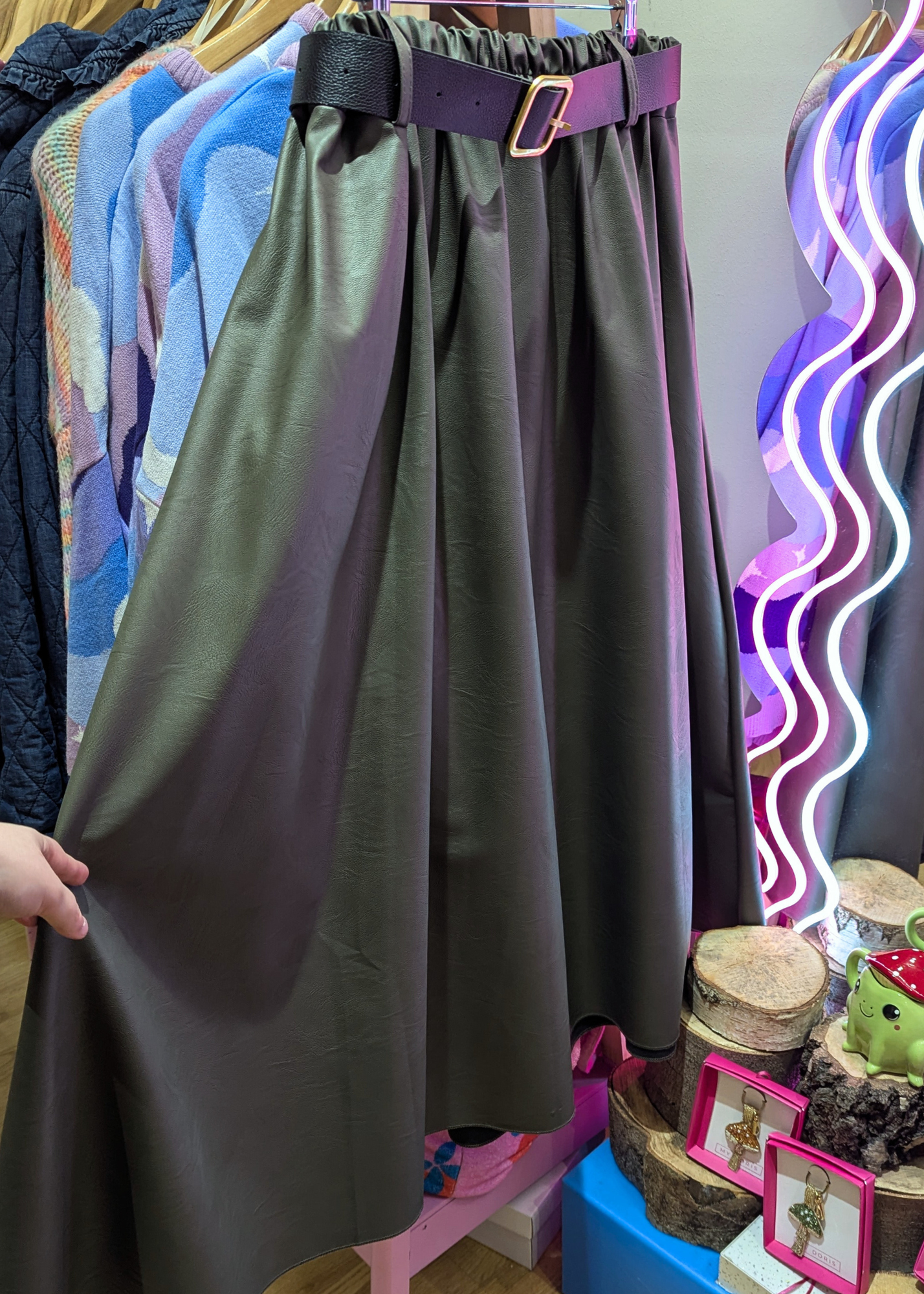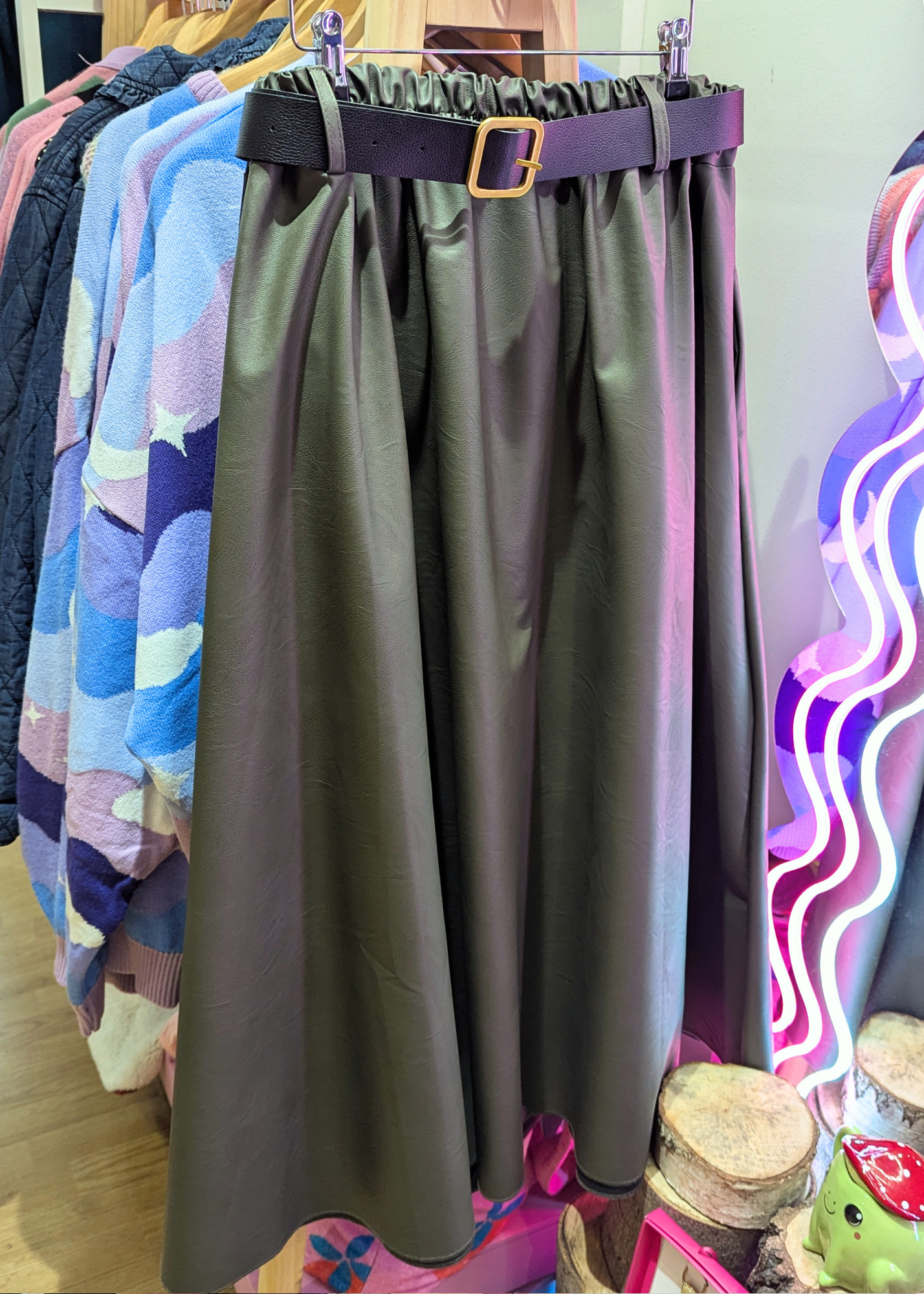 Faux Leather Khaki Midi Skirt – Hand-picked by the Thunder Egg team for The Edit